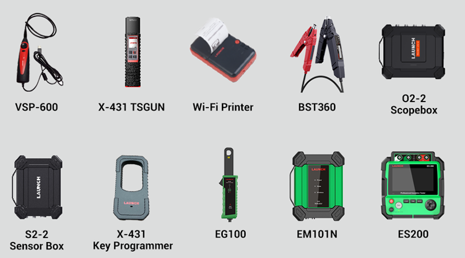 - Supports a wide range of add-on modules, including EV Add-on Kit, EG100, EM101N, ES200, X-431 Key Programmer, X-431 TSGUN, VSP-600, O2-2 Scopebox, S2-2 Sensorbox, BST360, Wi-Fi Printer, etc.